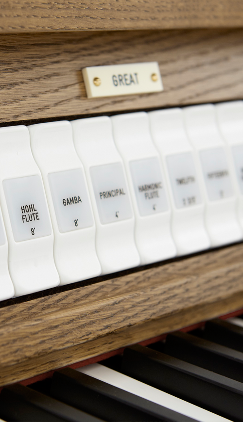The organ comes with a full set of traditional English divisional and general pistons and toe studs with two hundred and fifty piston memory. In addition, there is a thumb piston for each interdivisional coupler. Of course our instruments all have the very English 'Great & Pedal Combinations Coupled' function seen by many as indispensable in this country.